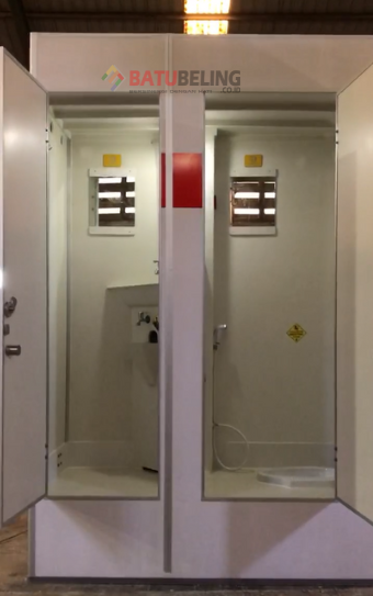 Unit toilet portabel dengan dua bilik, ideal untuk penggunaan pasangan atau ruang terbatas.