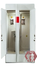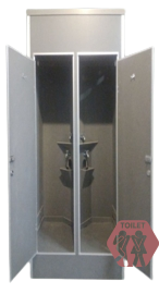 Unit toilet portabel dengan dua bilik, ideal untuk penggunaan pasangan atau ruang terbatas.